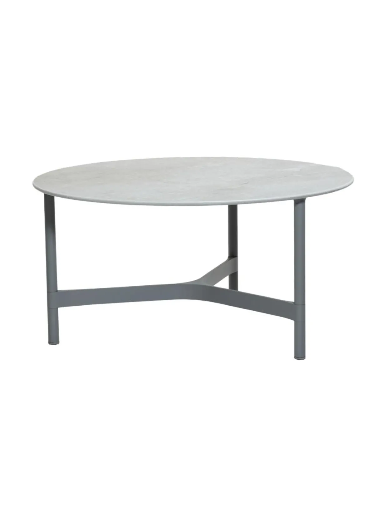 Twist -sohvapöytä ulkokäyttöön. 90 halk x 45 cm. Vaaleanharmaa jauhemaalattu alumiinirunko, keraaminen kansi, harmaa fossiilikuviointi. Helppohoitoinen. Toimii yksin tai muiden Twist-sarjan pikkupöytien kanssa yhdistettynä.