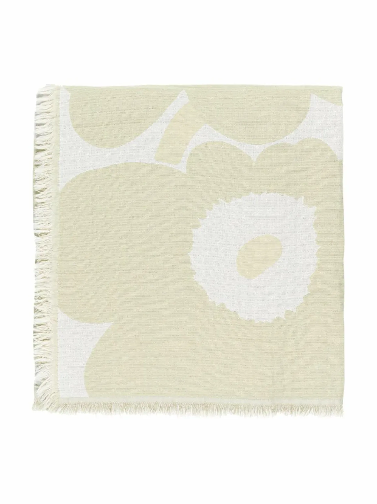 Jacquard-kudottu Unikko-kuosinen huopa Marimekolta on valmistettu luomupuuvillasta ja siinä on lyhyet hapsut joka sivulla. Kuosin värit ovat päinvastaiset huovan toisella puolella.