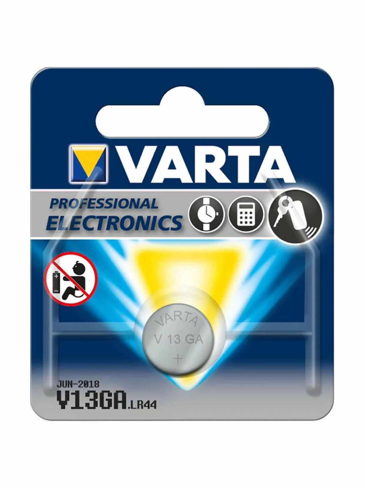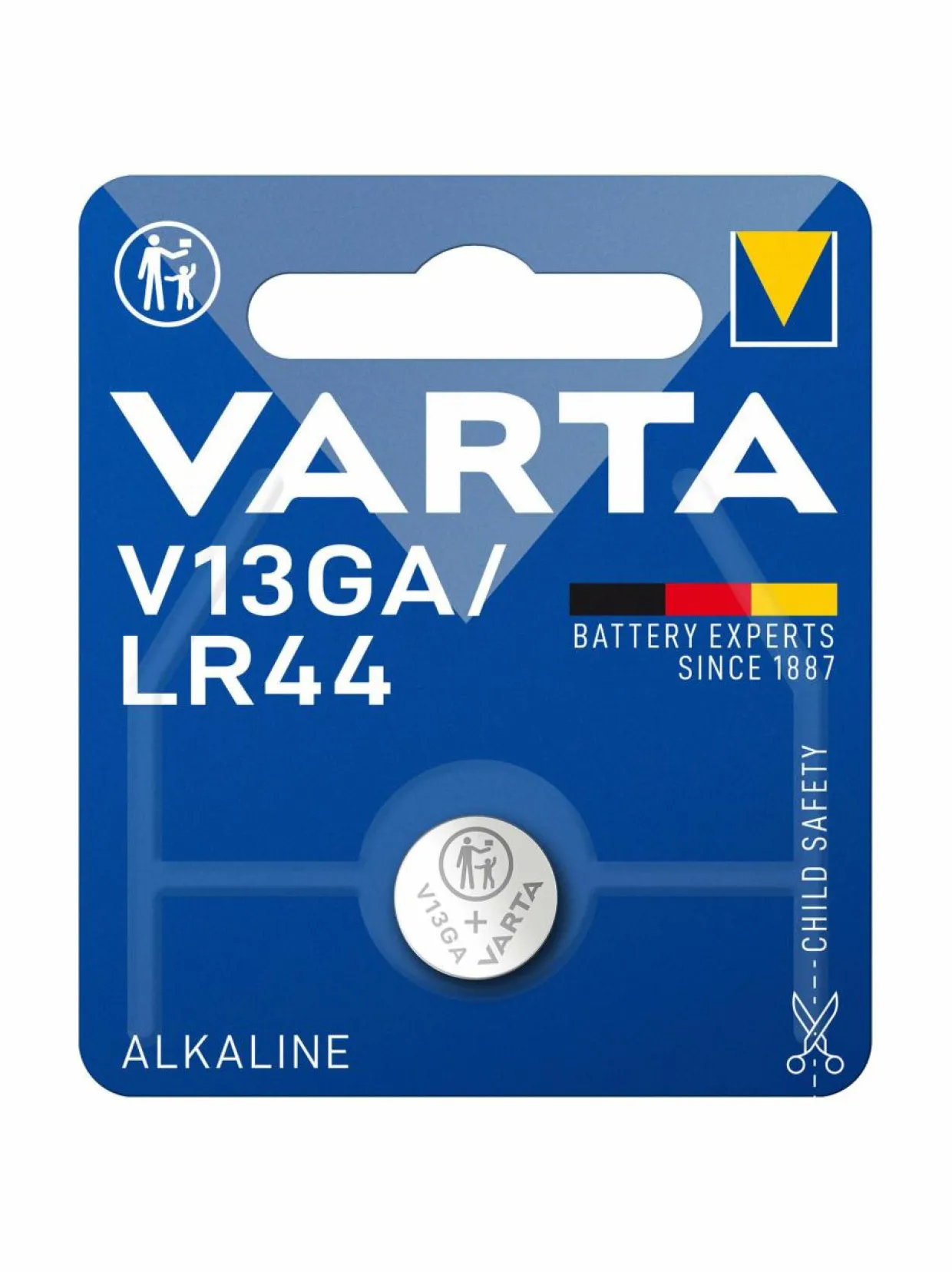 Pakkaus sisältää yhden jännitteeltään 1.5 V V13GA-nappipariston.