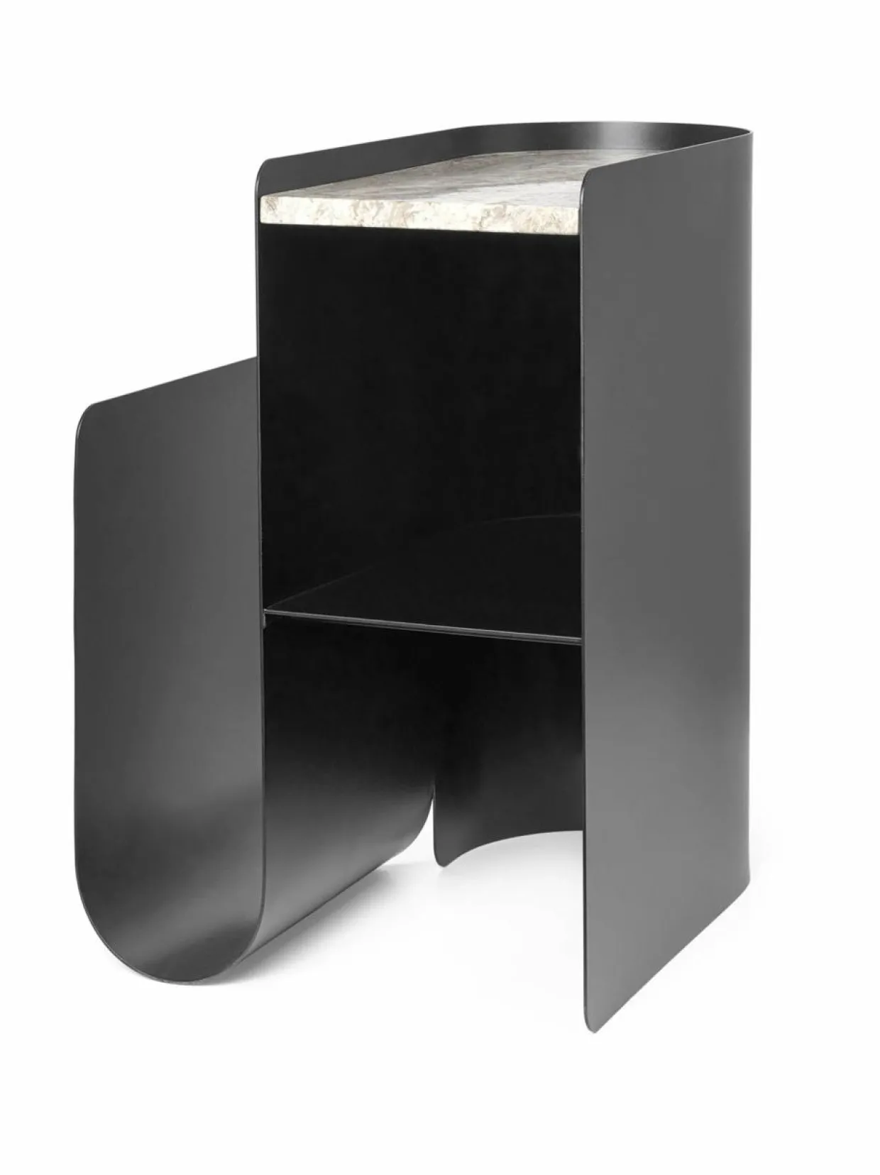 ferm LIVING Vault -sivupöydässä on elegantti, toiminnallinen muotoilu kaarevalla tuella jauhemaalatusta teräksestä ja pöytälevyllä marmorista. Vault-pöydän taivutettu sivuosa sopii lehtien ja kirjojen säilyttämiseen, kun taas sen hyllyt toimivat säilytyspaikkana esimerkiksi koriste-esineille. Sivupöydän hienostuneen ilmeen viimeistelee kauniista marmorista valmistettu ylätaso. Tuote on valmistettu luonnonmateriaalista, mikä tekee jokaisesta kappaleesta ainutlaatuisen.