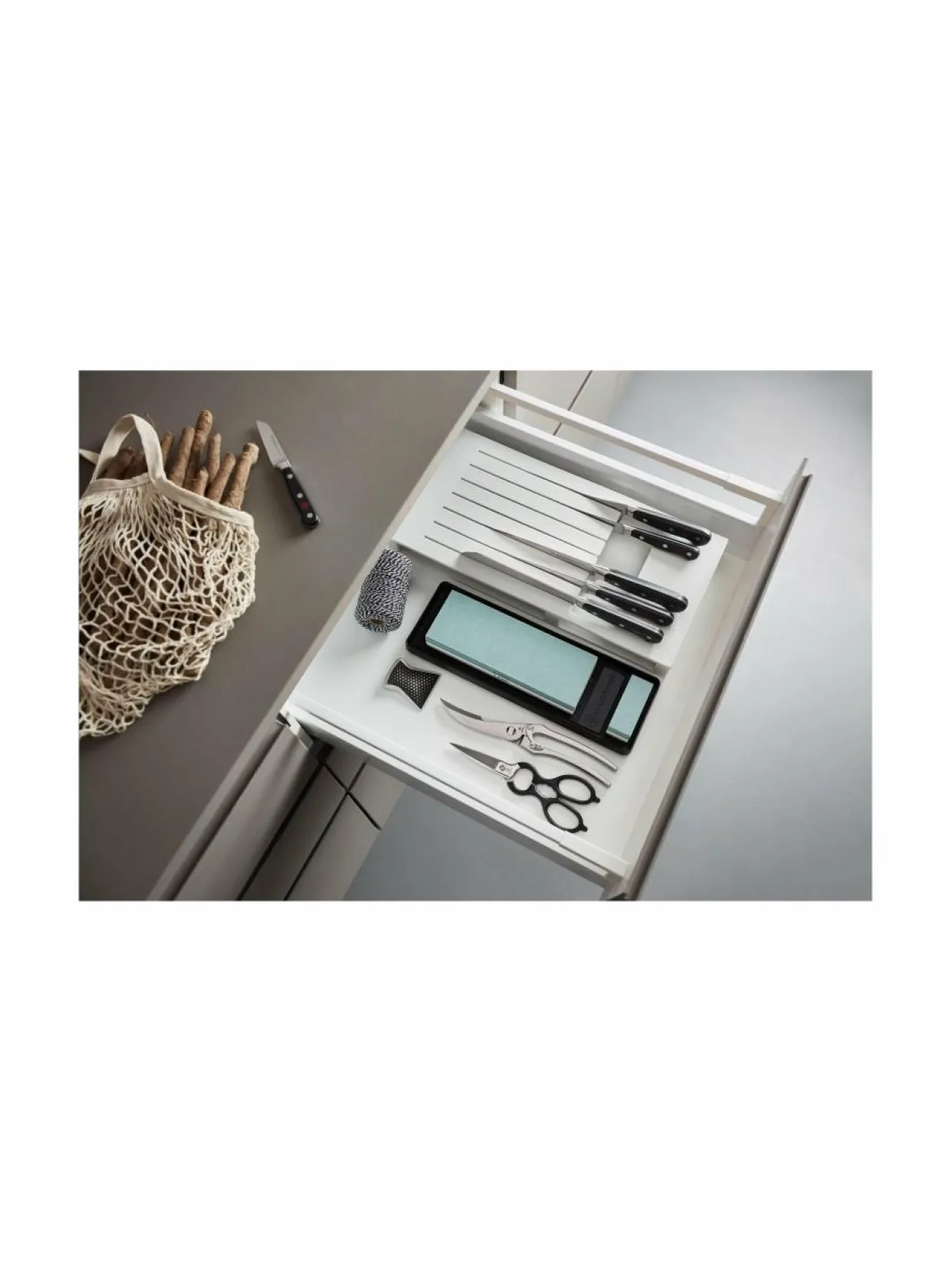Wüsthof-veitsiteline säilyttää veitset terävinä ja järjestyksessä siististi vetolaatikossa. Telineestä veitsen kahvaan on helppo tarttua ja terät ovat samalla suojattuina. Muovisen telineen voi pestä tiskikoneessa. Telineeseen menee seitsemän veistä, joiden terän pituus on enintään 23 cm. Mitat L 22 x K 4 x S 43 cm.