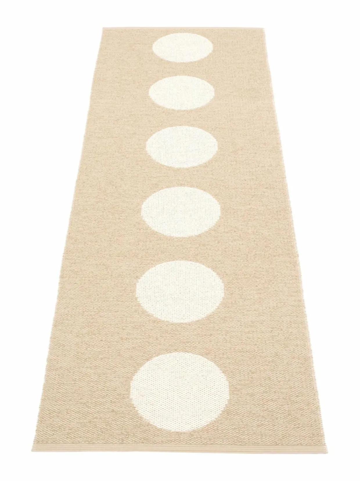 Ruotsin Taalainmaalla käsityönä valmistetut Pappelina-muovimatot ilahduttavat raikkaan skandinaavisella ilmeellään ja käytännöllisyydellään. Polyesteriloimesta ja ftalaatittomasta muovista valmistetut matot sopivat kodin kaikkiin tiloihin ja puhdistuvat helposti käsin tai koneessa. Selkeäkuvioinen Vera-matto kuuluu Pappelinan suosituimpiin malleihin vuodesta toiseen, ja siitä on kovaa vauhtia tulossa skandinaavisen muotoilun moderni klassikko. Käytännöllisestä muovimatosta on saatavilla useita eri värejä ja kokoja, joista löytyy helposti sopiva matto niin kylpyhuoneeseen, eteiseen, keittiöön kuin lastenhuoneeseenkin. Käännettävän maton toisella puolella on sama kuvio vastakkaisin sävyin.