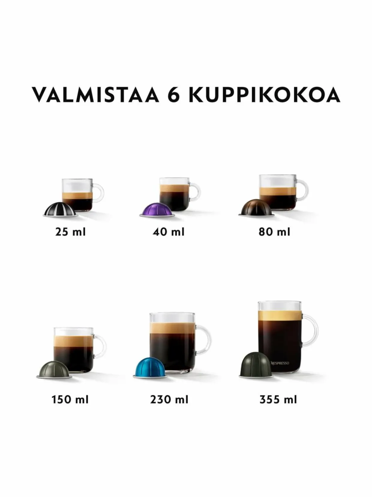 Nespresso Vertuo Pop – väriä elämääsi! Valitse Nespresso Vertuo-kahvikapseli, aseta se koneeseen, paina nappia ja olet valmis. Kone tekee loput: Nespresso Vertuo Pop lukee kapselin viivakoodin automaattisesti ja uuttaa optimaalisella lämpötilalla baristatyylisen kahvin täydellisellä cremalla kruunattuna, joka kerta.Nespresso Vertuo Pop-kahvikone lämpenee käyttövalmiiksi 30 sekunnissa laitteella voi valmistaa kuutta eri kahvikuppikokoa: Ristretto 25 ml, Espresso 40 ml, tuplaespresso 80 ml, Gran Lungo 150 ml ja Mug 230 ml ja Alto 355 ml. Nespresso Vertuo Pop kapselikeittimen Centrifusion-uuttamisteknologia mullistaa Nespresso-kokemuksesi. Kahvikone lukee kahvikapseleiden yksilölliset koodit ja säätää uuttamisasetukset niiden mukaisesti.