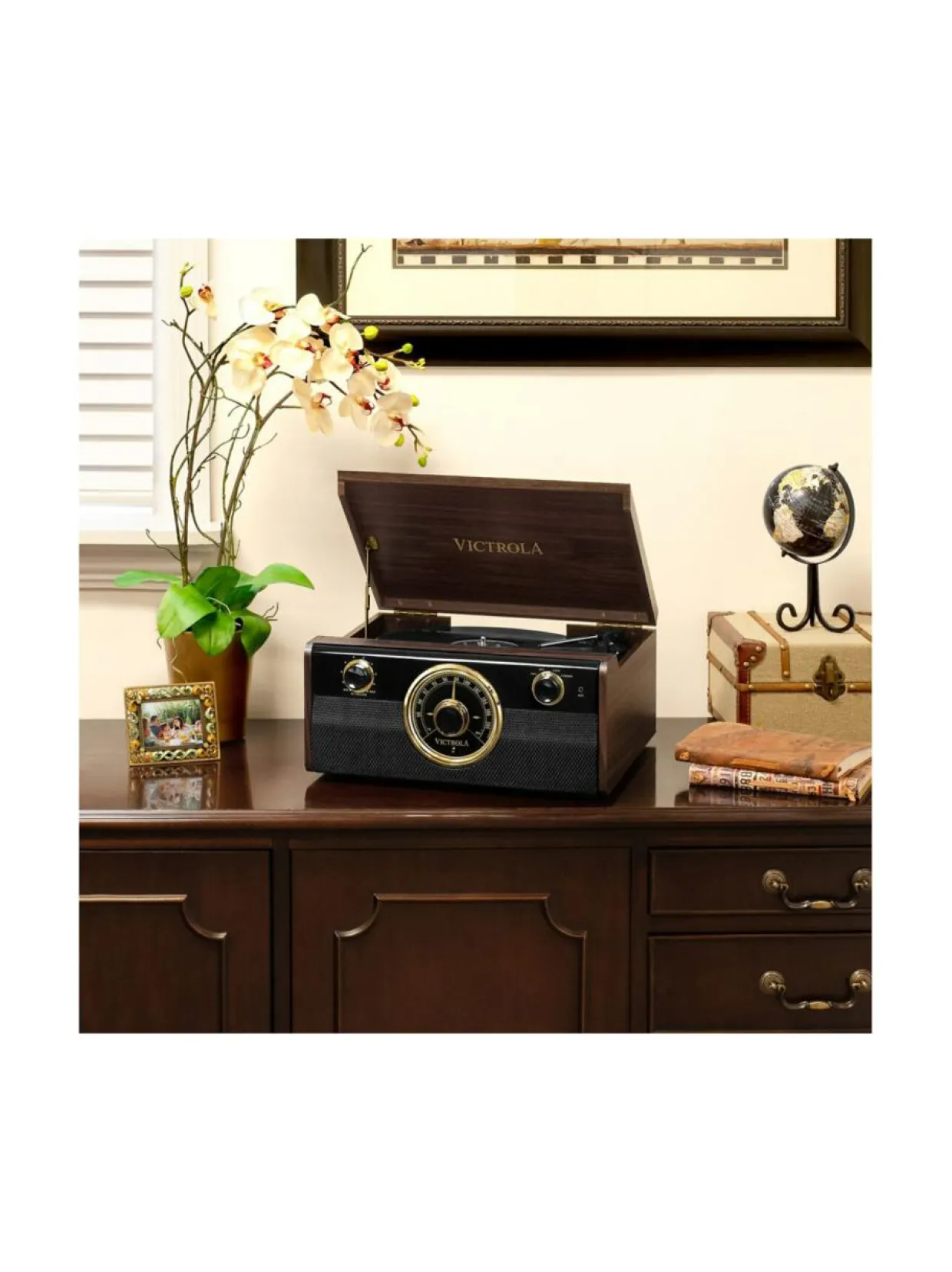 Victrola Empire Jr on 4-in-1 Bluetooth-levysoitin, joka yhdistää perinteisen ilmeen ja modernit ominaisuudet. Tämä kompakti äänentoistojärjestelmä sisältää 3-nopeuksisen levysoittimen (33 1/3, 45 ja 78 RPM), joka mahdollistaa vinyylilevyjen kuuntelun, FM-radion analogisella virittimellä sekä Bluetooth-yhteyden musiikin langattomaan suoratoistoon yhteensopivilta laitteilta. Lisäksi laitteessa on 3,5 mm