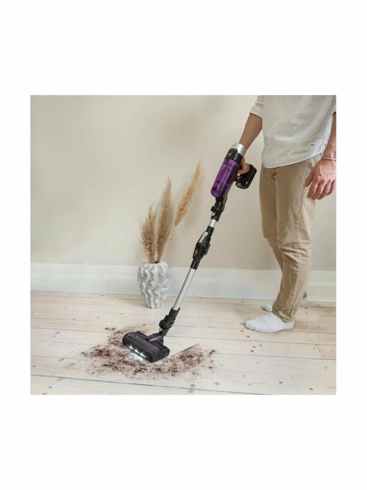 Pölynimurin kahvassa on Boost-liipaisin, jonka avulla voit helposti vaihtaa tarvittaessa tehokkaimpaan imutehoon. Boost-toiminto mahdollistaa peräti 100 ilmawatin imutehon. Imuri puhdistaa perusteellisesti, sillä se erottelee ilman ja pölyn sekä suodattaa jopa 99,9 % hienosta pölystä, allergeeneista ja pölypunkeista. Moottoroitu harjasuulake ulottuu helposti ja tehokkaasti kaikille pinnoille, koska se on nivelletty kääntymään 180 astetta ja siinä on integroitu LED-valo. Varsi-imurissa on lisäksi kaksi integroitua harjasuulaketta.